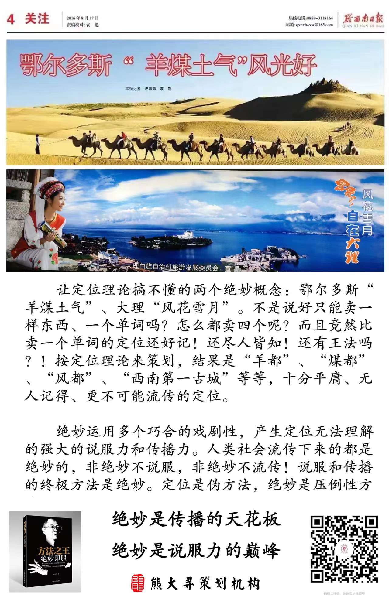 熊大寻旅游策划公司认为定位理论是伪方法。一个产品、一个城市只卖一个单词,这样就能让人记住吗?NO!记忆、说服、流传的核心和秘密都在于多个巧合形成的戏剧性。鄂尔多斯”羊煤土气”、大理“风花雪月”都是卖四样东西,但是都比仅卖一个单词、一样东西的“羊绒之都”、“风都”好记一百倍!说服力高一百倍!流传度高一万倍!”羊煤土气”、和“风花雪月”都是绝妙的城市形象概念,都与成语有四个巧合。绝妙才是营销之王、传播之王。根本不是定位。